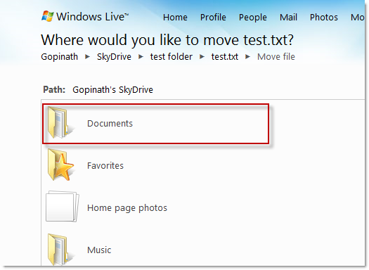2. Click on the the option either Move or Copy depending on what on what operation you would like to do (I’m going to choose Move for illustrating screenshots in this article) . SkyDrive display all the folders available in your account